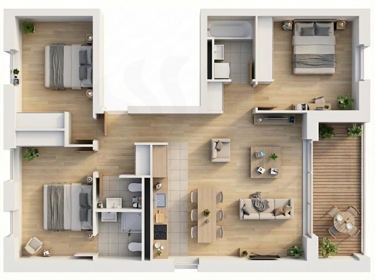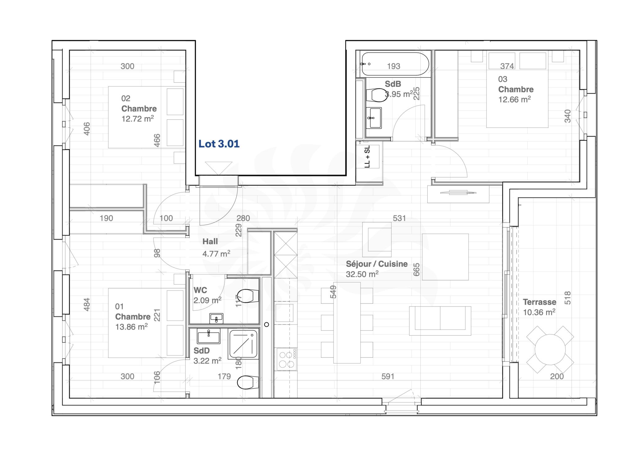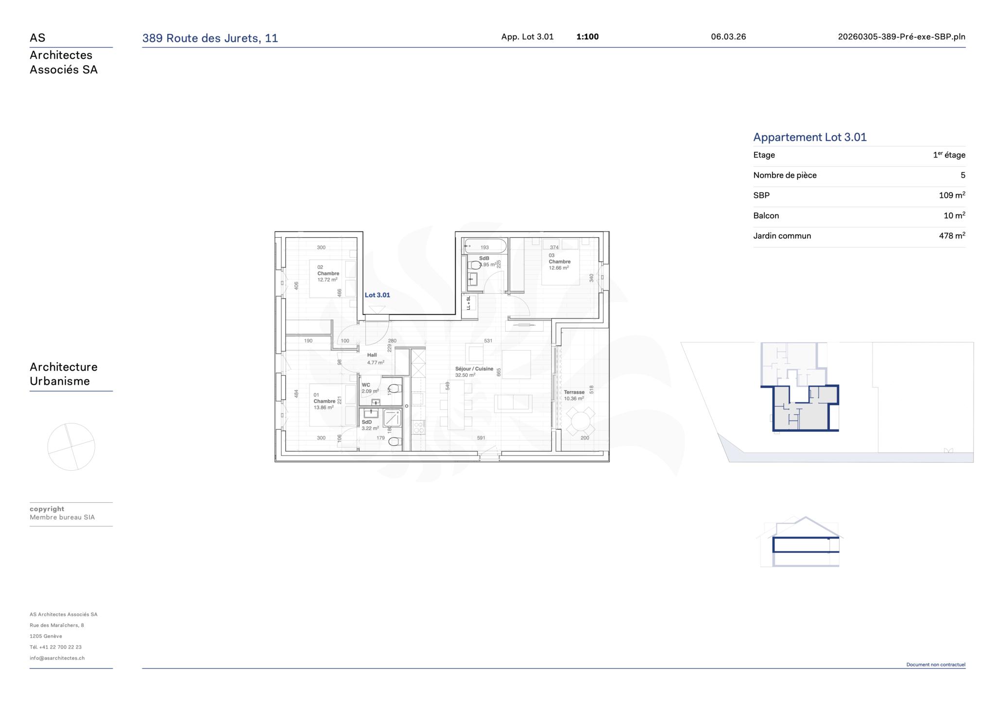 Lot 3.01, appartement 5 pièces de 109 m2 PPE, balcon de 10 m2, jardin commun de 478 m2, surface de vente 114 m2